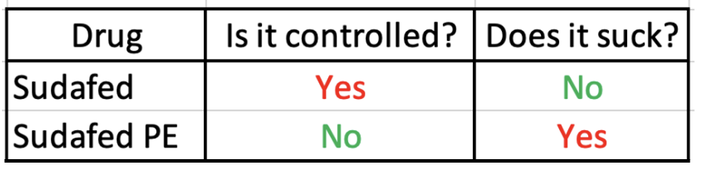 As I have written before, thanks to the Combat Methamphetamine Epidemic Act (CMEA) (4) of 2006, Sudafed went from over-the-counter to behind it in a ridiculous attempt to address the "meth crisis." How did that work out? Not so well. The inability to get large quantities of Sudafed made things worse as chemists, using an easy workaround, started making a whole lot more of cheaper, purer meth. It's being made using the truckload by the superior P2P method.