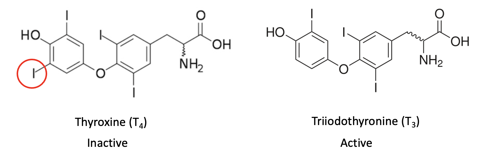 Figure 1. The two primary thyroid hormones. Most of the iodine in the body is stored in the thyroid gland in the inactive T4 form, which is converted (reversibly) to T3 by a complex feedback process. Chemically, the only difference between the two is iodine (red circle) in T4 replaced by a hydrogen in T3.