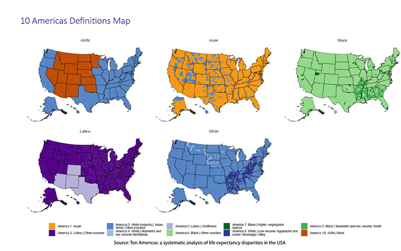 The researchers began defining “ten mutually exclusive and collectively exhaustive Americas comprising the entire US population,” beginning at the county level and assigning each to one of ten unique combinations (Americas). Two caveats to note: the data from the US Census and the Multiple Cause of Death Files from the National Vital Statistics System do not clearly delineate race or ethnicity – so Asian, Native Hawaiian, and Pacific Islander are clearly fuzzy, as are other categorizations leading to bias. Additionally, though we are about to talk about the ten Americas, there are, at times, significant “differences in life expectancy between counties (including counties grouped together in this analysis), even for the same racial and ethnic group.” The bottom line is that the ten Americas are inherently subjective, but they provide a lens illustrating the synergism of multiple factors over the usual simple reductive analysis.