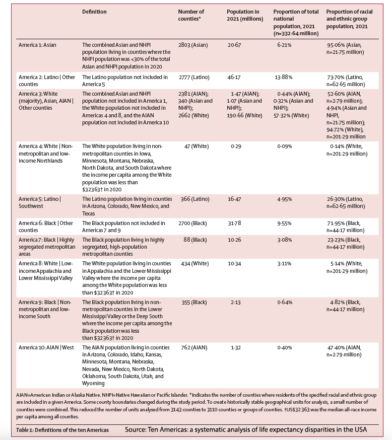 With the election in the rear-view mirror and the repercussions in the windshield, The Lancet is reporting an update on their Eight Americas study, which is now morphing to ten. Eight or ten Americas? Are we not a melting pot? I will leave that for others to consider [1]. Still, in this current study of American life expectancy, the population initially stratified into groups based on race, geographical region, urbanicity, income per capita, and homicide rates is updated a bit and now includes ten groupings. [2]