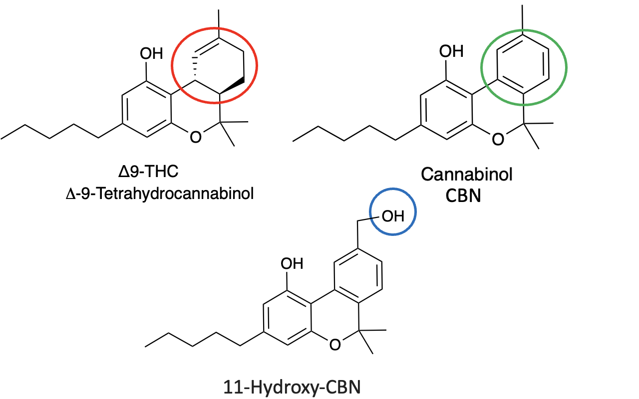 As if the chemistry of cannabinoids isn't complicated enough, the Sydney group made an unexpected discovery. Analysis of the brains of rats that had been dosed with CBN showed CBN (duh) and its oxidation product 11-hydroxy-CBN – surprisingly present in equal amounts. Is this compound also sleep-inducing? Sort of.