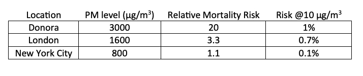 To compare and provide perspective, I scaled these historical exposures to current ambient levels of 10 µg/m3 using straight-line relationships. Excess risks were less than 1% and similar to those reported from modern-day epidemiology studies over much longer periods.