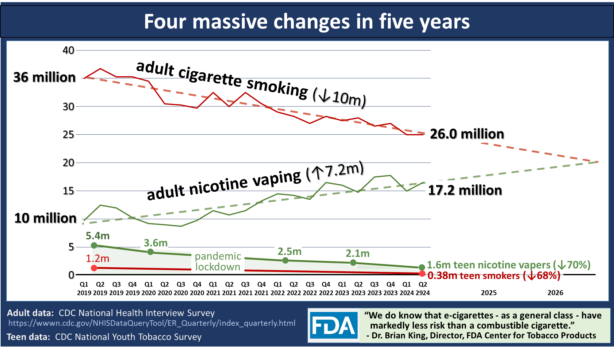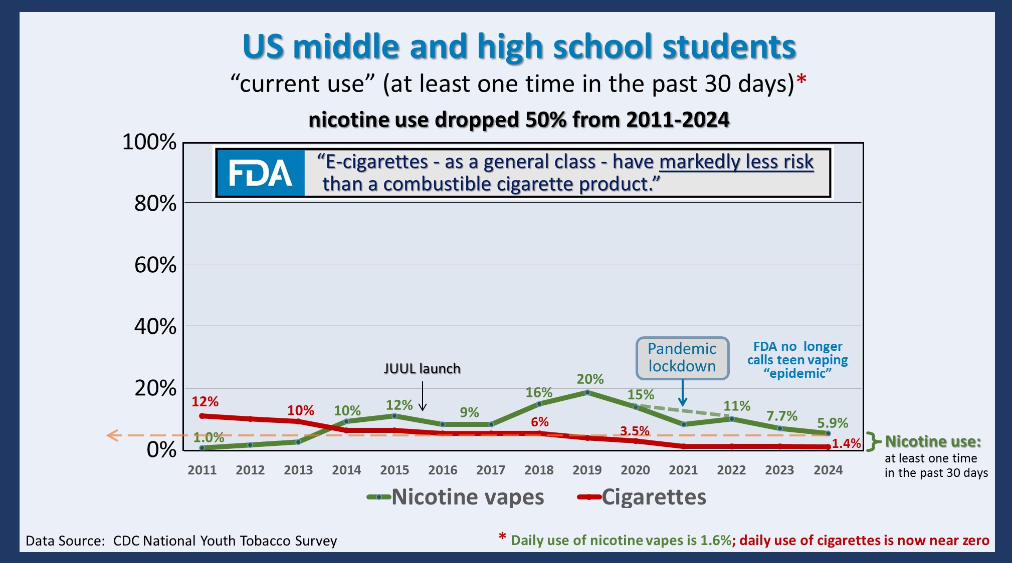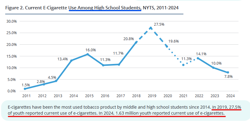 There were several other oddities in Truth's presentation of the NYTS data. First, the report stated that "In 2019, 27.5% of youth reported current use of e-cigarettes. In 2024, 1.63 million youth reported current use of e-cigarettes." By comparing a percentage to a whole number, Truth further obscured the decline in youth vaping from 2019 to 2024. "Without knowing the denominator you have no idea how the percentage has changed," my colleague Dr. Chuck Dinerstein added. "Mixing metrics in the same two sentences is either intentionally misleading or ignorance of how to properly display and provide data."