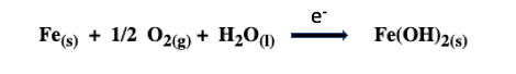 The oxidation of iron by oxygen is promoted by the addition of an electric current (e-). The product is ferrous hydroxide, aka rust.