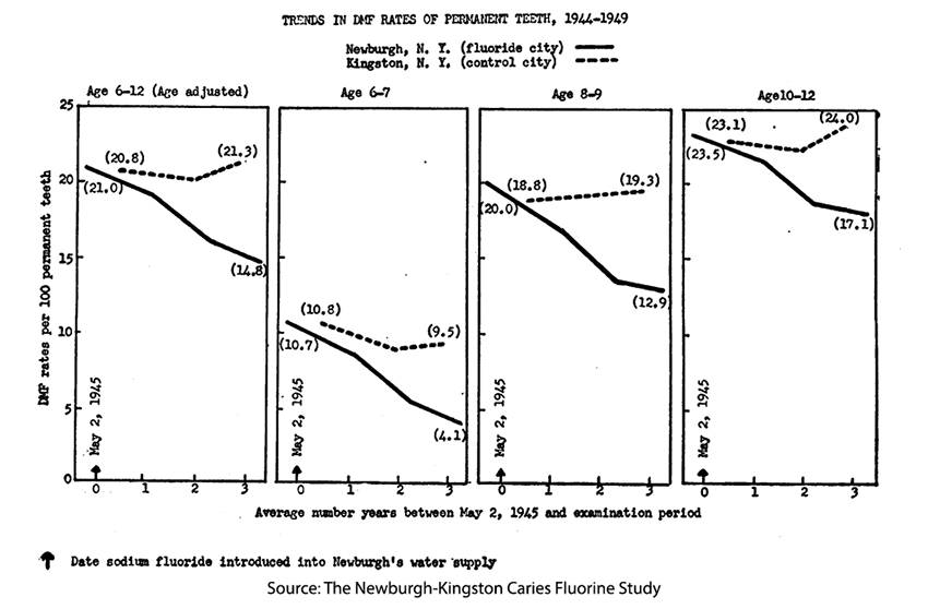 Further breakdown showed that the first permanent molars, typically most prone to decay, saw an 18% reduction in caries in Newburgh. The more resistant anterior and lateral incisors, which erupt soon after those first molars, fared even better, experiencing a 55% reduction. This correlation between water fluoride levels and cavity prevention reinforced earlier findings. It also raised a question that continues to befuddle: Is the effect of fluoride topical or systemic? – the protection of newly erupted teeth suggests that it is systemic.