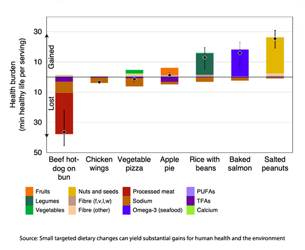 The graph shows the harmful impact of hotdogs (that Joey Chestnut is alive must be a tribute to medical care) and the beneficial effects of peanuts despite their being salted.