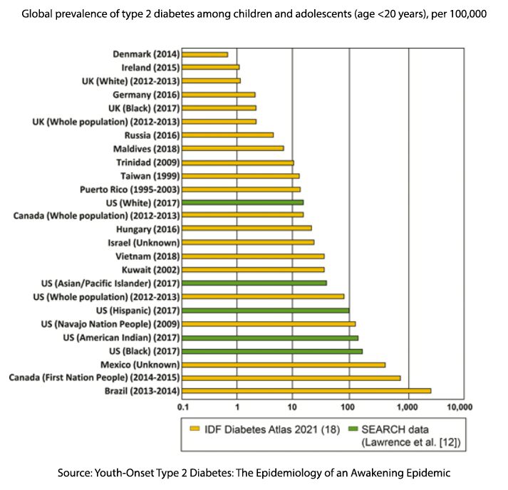 The researchers tell us that “type 2 diabetes prevalence is highest among adolescents in Brazil (33 per 1,000) … and youth in Mexico (4 per 1,000),” both of which implement a Latin diet. The “healthy” Asian diet consumed in Vietnam results in a diabetes level higher than the US white population, as the “healthful” Mediterranean diet does in Israel.