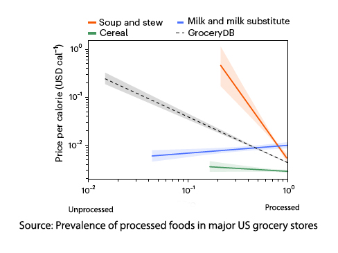 All three stores display a similar overall pattern—with most products falling into the ultra-processed category and relatively few minimally processed items. Despite this common trend, some key differences emerge: Whole Foods carries more minimally processed options and fewer ultra-processed products, while Target has a particularly large share of ultra-processed items. Notably, although minimally processed foods occupy a smaller portion of total inventory, they likely account for a disproportionately larger share of actual purchases.- A 10% increase in the calculated degree of ultra-processing corresponded to an overall 8.7% drop in the price per calorie. Ultra-processed foods are less expensive and more calorie-dense. To add complexity, the impact of ultra-processing on price varied widely with the food category – a 24% drop for soups, 1.2% for cereals, and a price increase for those plant-based milks (which are more processed than cow’s milk). Categories such as jerky, popcorn, chips, bread, biscuits, and mac and cheese show limited processing choices for consumers. While the nutritional “scolds” point
