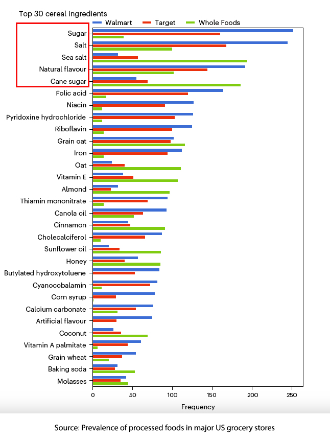 Not surprisingly, there are differences in the product offerings of the three stores when examining the ingredients. [2] The researchers point to cereals where Whole Foods offers cereals with lower sugar content, fewer artificial and natural flavors, and fewer added vitamins. In contrast, Walmart and Target products more often include corn syrup as a sweetener. However, there is a sleight of hand at work here. Take a look at those cereal ingredients boxed in red.