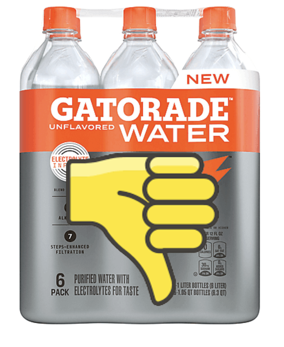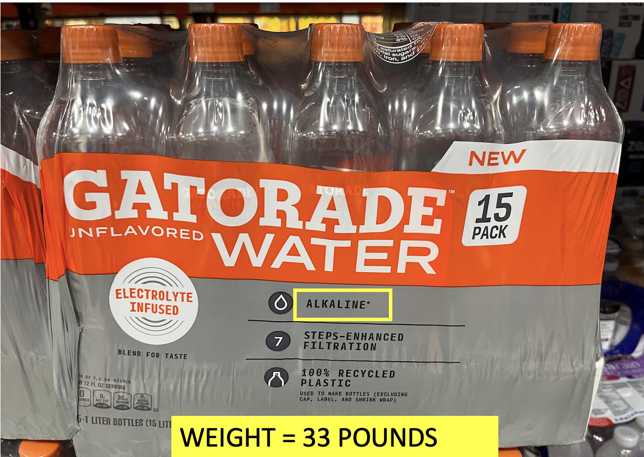 Gatorade Water? Yes, such a thing exists. It has "no flavor" and costs about $20 for a 15-pack of 1-liter bottles. Better still, it's alkaline!