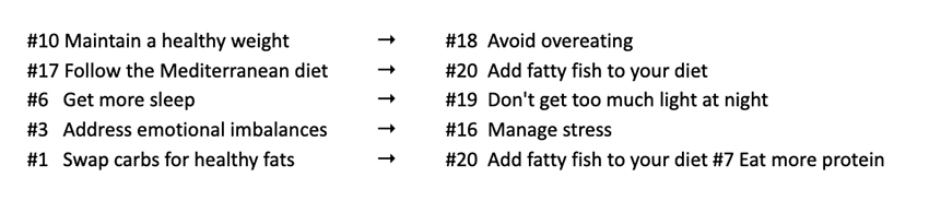 Like most listicles, this one is an odd blend of the unbelievably generic and suspiciously specific. We have “Stop smoking, get more sleep, eat more fiber, and exercise” juxtaposed with “Follow the Mediterranean diet and use these seven types of supplements.” The generic advice is fine, but it's boring, which is one reason why it's mixed in with specifics. Most people know that they should be trying to get enough sleep. At this point, everyone knows that smoking is bad for you. It's not sexy to tell people to “manage your stress” and “get more exercise.” That advice is not what attracts eyeballs and earns the coveted click. The specific advice does.