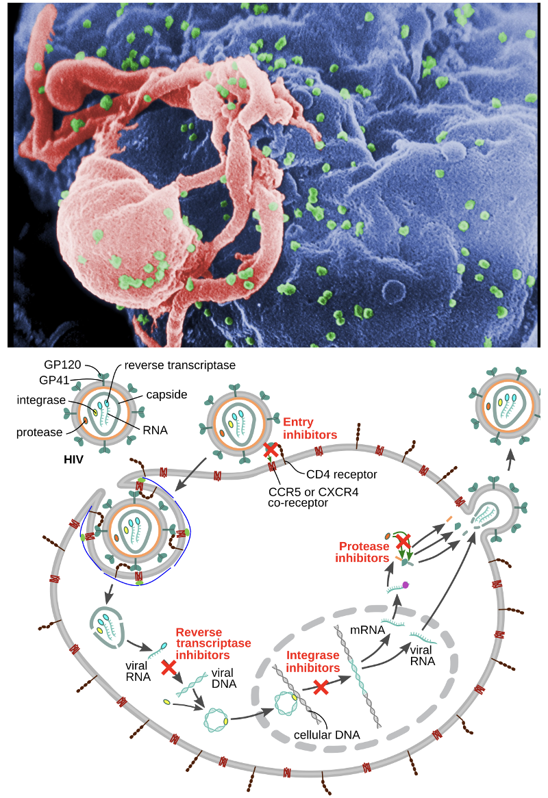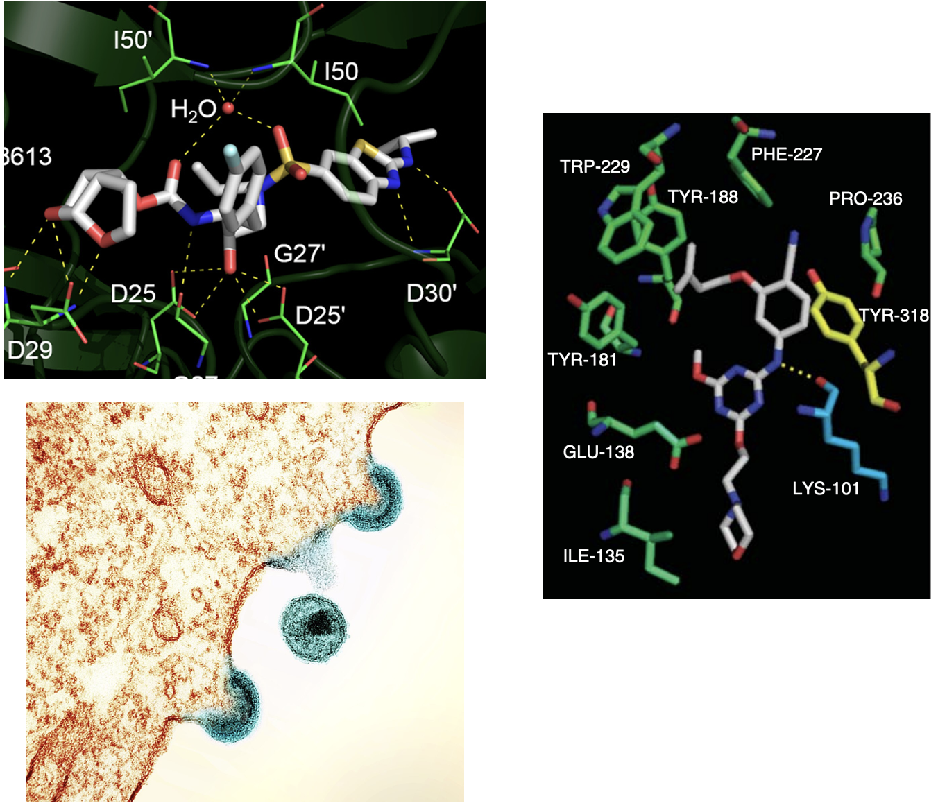 Figure 1. Three different HIV life cycle steps aka targets, are shown at the molecular level. (Left) The X-ray crystal structure of an HIV-protease inhibitor bound to the active site of the enzyme. (Right) The X-ray crystal structure of an HIV reverse-transcriptase inhibitor bound to the enzyme HIV reverse transcriptase. (Bottom) An electron micrograph below shows new (progeny) HIV particles budding from an infected H9 cell (2). Source: Wikimedia Commons, ASM Journals, Expert Opinions on Therapeutic Patents