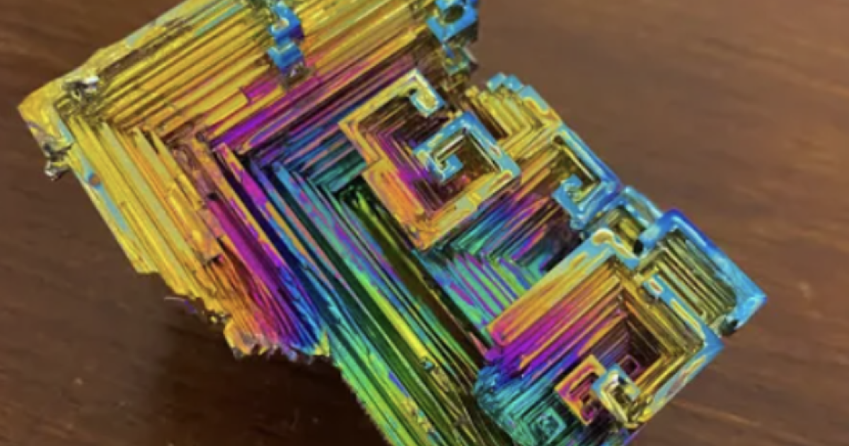 When bismuth is left in air it reacts with oxygen to give a thin film of bismuth oxide. The oxide has light-scattering properties, which are responsible for the colors. The colors are dependent on the thickness of the film. Wow! (Photo: Etsy)