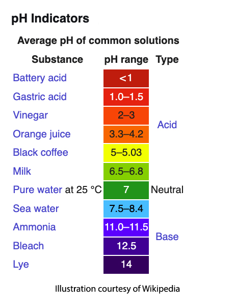 [1] A quick reminder: pH is the yardstick for measuring acidity and alkalinity; the lower the number, the more acidic. A pH of 7 is neutral, like water and salt; those below 7 are acidic, like lemon juice, vinegar, stomach acid, and our skin. Chemicals with a pH above 7 to 14 are “basic” or alkaline, like lye, which is highly corrosive.
