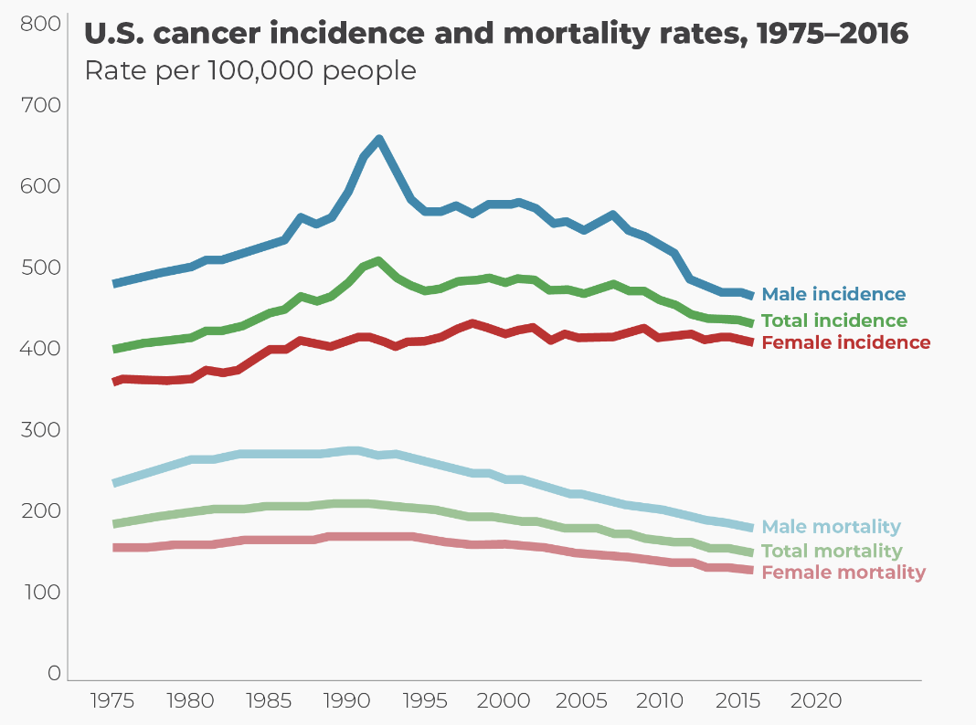 The incidence (2) of cancer in the US has been steadily falling since 1990. Image: HumanProgress