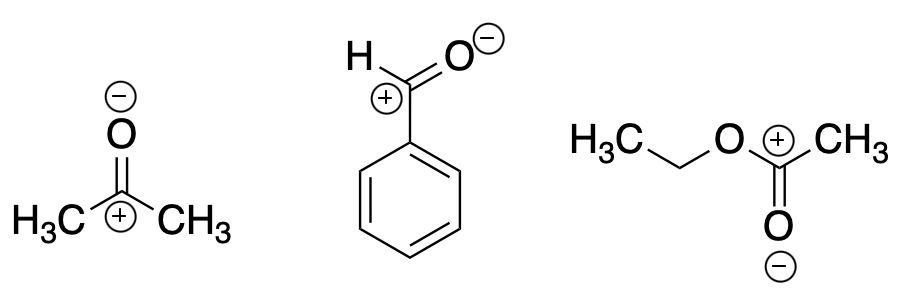 Figure 1. Some common electrophiles (left to right): Acetone, benzaldehyde, and ethyl acetate. Note the partial positive charges on carbon and partial negative charges on oxygen. Can anyone explain why this occurs?