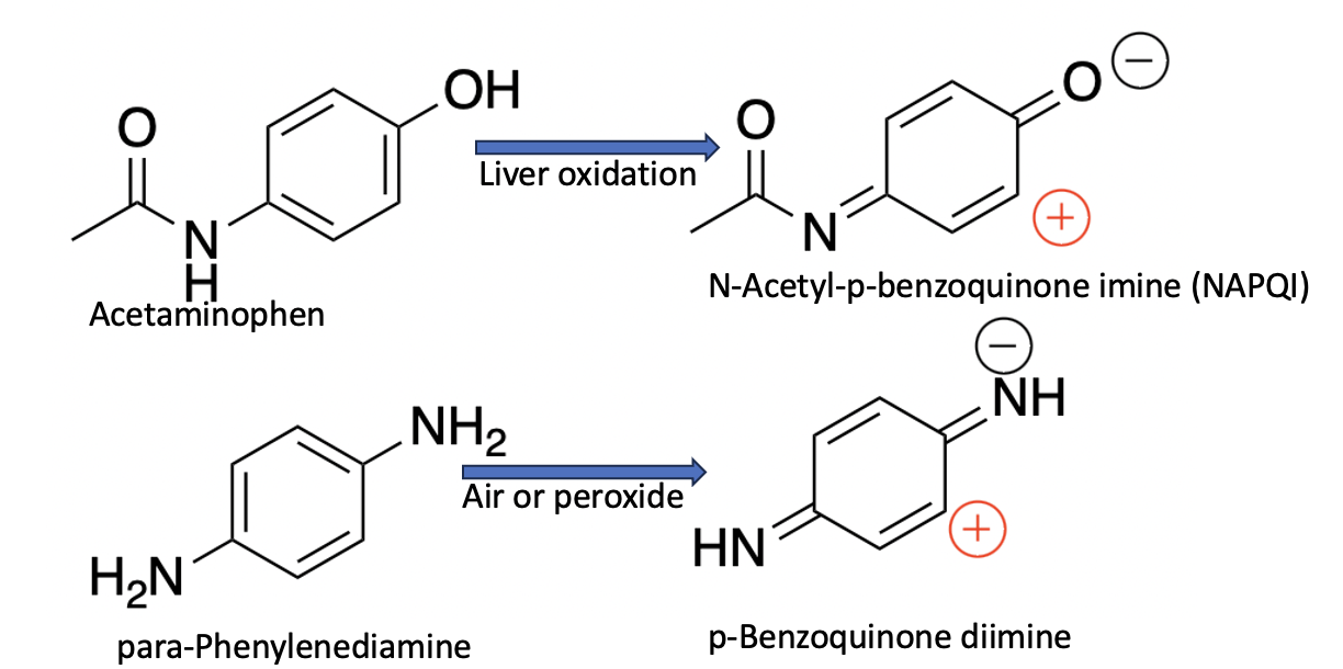Plenty. Figure 2 shows the oxidation of both acetaminophen and p-phenylenediamine. Note that the oxidation products are very similar in structure; the products are very potent electrophiles, which means they form similarly highly reactive (3) transient intermediates. In the case of acetaminophen, the toxic metabolite is N-acetyl-p-benzoquinone imine, which has mercifully been given the nickname NAPQI. In the case of paraphenylenediamine, the toxin formed is p-benzoquinone diimine. To an experienced organic chemist, both of these look like trouble.