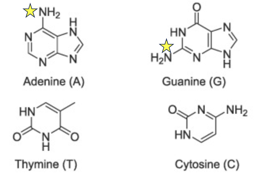 Figure 3. DNA nucleobases, especially adenine and guanine have nucleophilic nitrogen atoms (yellow stars) and are therefore susceptible to attack by electrophiles. The stars indicate the nitrogen atoms in DNA most likely to react with electrophiles like NAPQI.