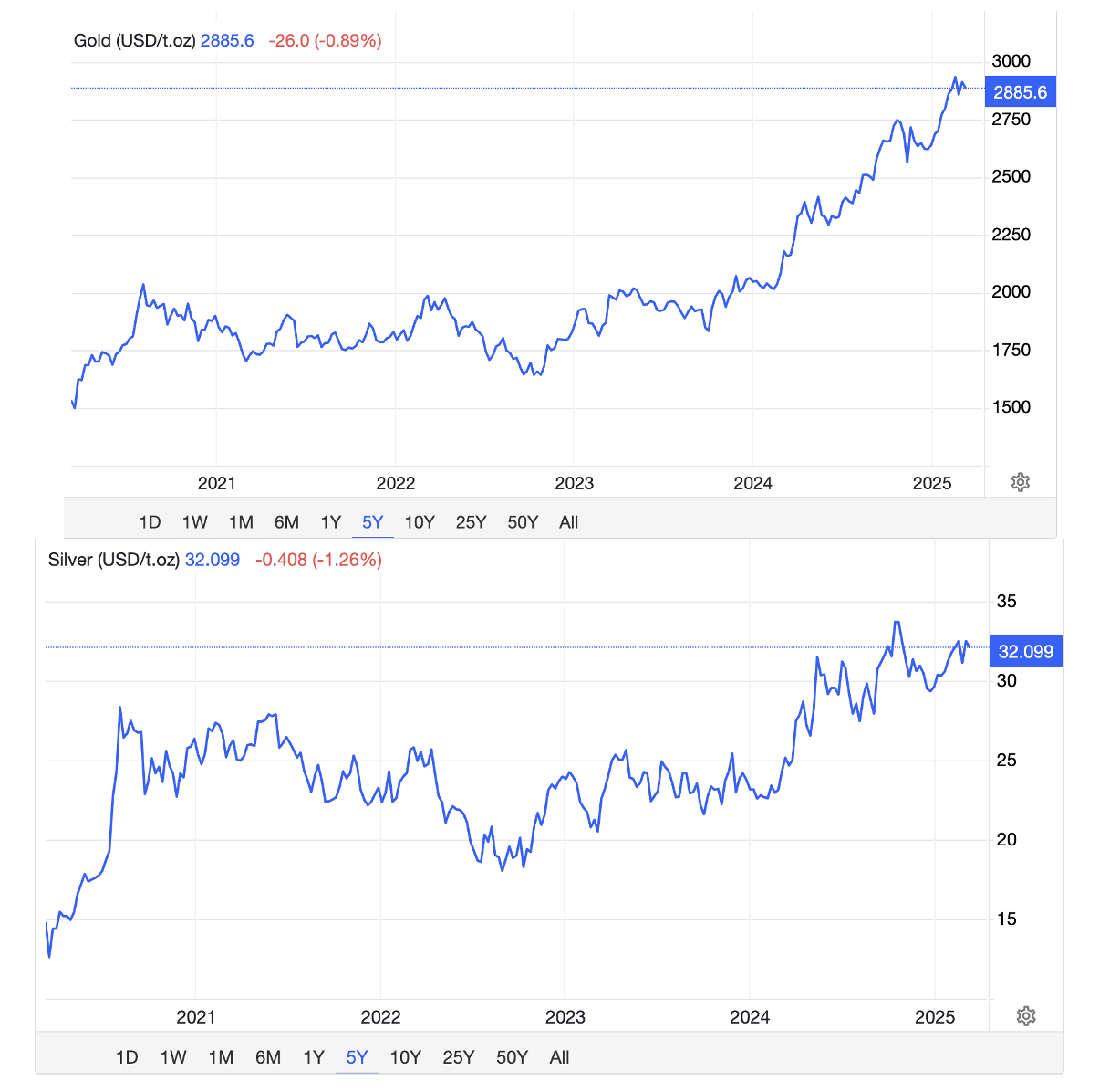 The charts below show the rise in gold and silver prices over the past 5 years. They've both roughly doubled.