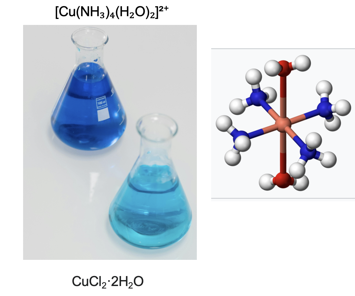 (Left) Copper II chloride turns from light blue to dark blue when ammonia is added. (Right) The 3D structure of the complex contains a central copper ion (red) bound to four ammonia molecules (blue and white spheres) and two molecules of water (red and white spheres). Credit: Pexels. The silver ammonia complex is a colorless solution, looking like water.