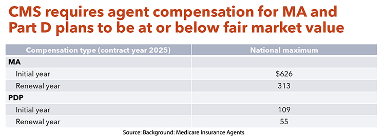 These Medicare sherpas do not receive federal funds but are paid commissions by the insurers for enrolling beneficiaries in MA, Medigap, and PDP plans. As with any business, additional incentives for marketing and meeting benchmarks, e.g., enrollments, may exist. Typical commissions are 20% for initial enrollment and 10% for renewals, with caps set by Medicare.