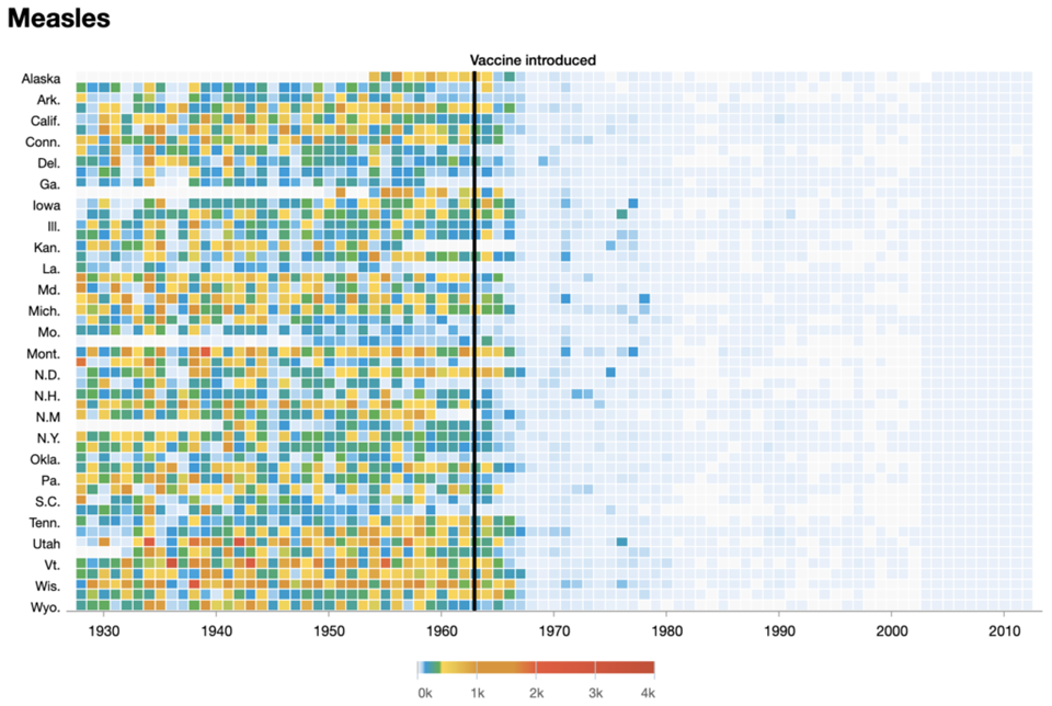 And this chart shows the number of cases per 100,000 people before and after the introduction of the measles vaccine.