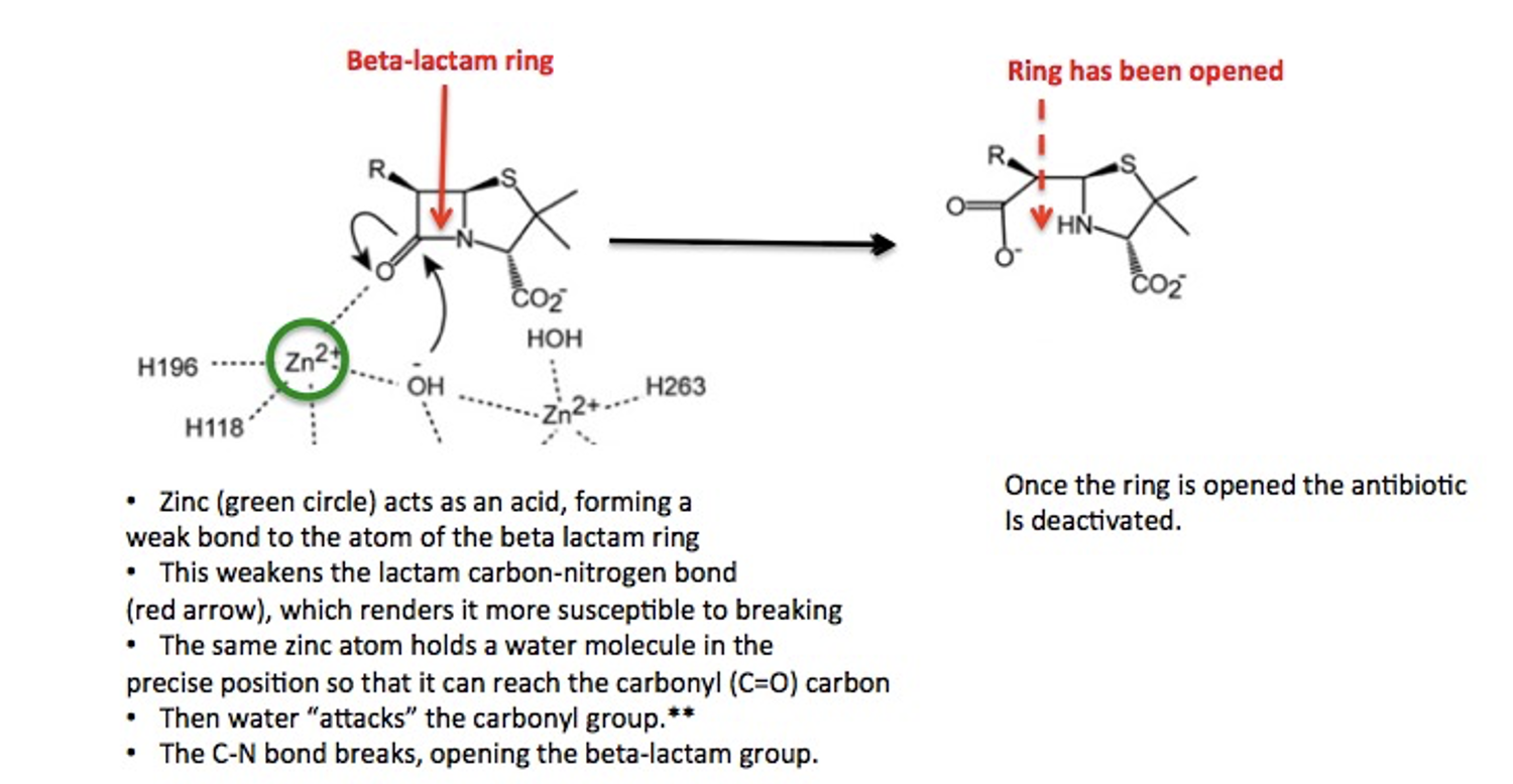 Figure 1. Zinc inactivates beta-lactam antibiotics by helping an enzyme attack the drug’s reactive ring. Zinc holds a water molecule in place, helping break open the ring. Once it’s open, the drug is useless. ** It's actually a bit more complicated than this.
