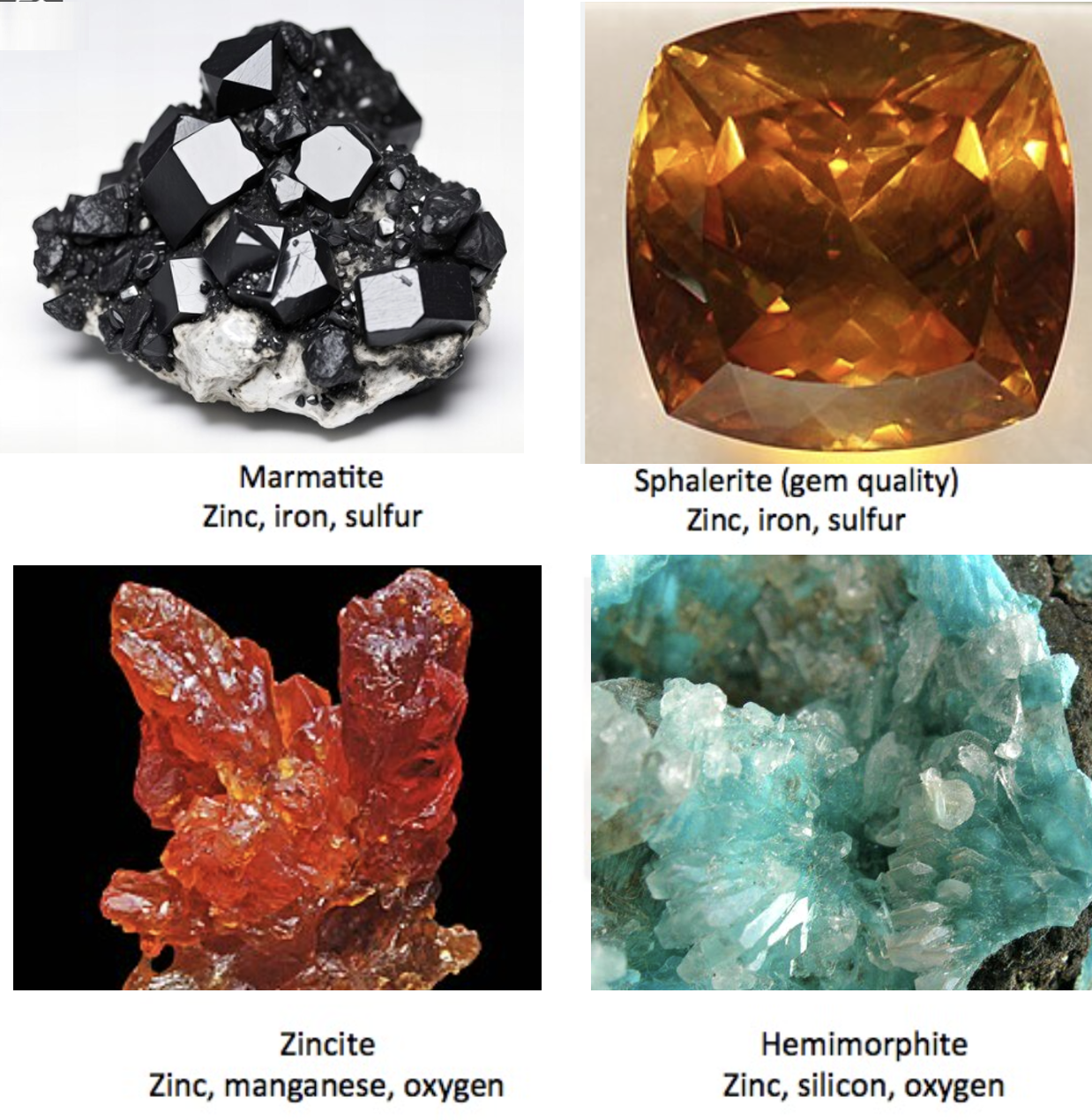 Some zinc-containing minerals. Photos: Freepik, Wikipedia, Wikimedia Commons, Wikimedia Commons