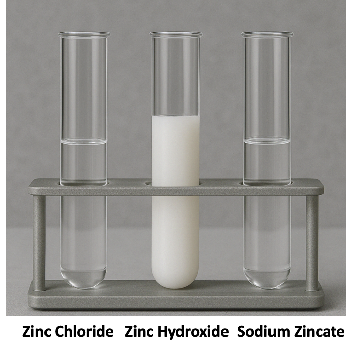Add more sodium hydroxide (a base), and the same thing happens—the white solid disappears. This time, zinc hydroxide is behaving as an acid, forming a water-soluble compound called sodium zincate.
