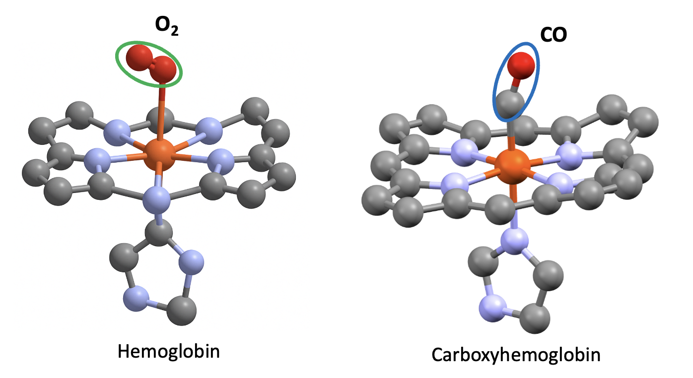 Figure 1. The structures of hemoglobin (L) and carboxyhemoglobin (R) differ only by the molecule bound to the iron atom (orange). In normal hemoglobin, iron binds oxygen (O₂), enabling its transport throughout the bloodstream. In carboxyhemoglobin, the iron binds carbon monoxide (CO) instead, blocking oxygen transport and leading to asphyxiation. The green oval shows the oxygen molecule normally bound to hemoglobin. The blue oval highlights carbon monoxide