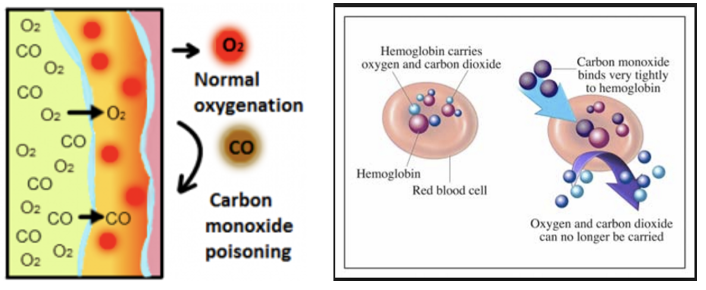 Figure 2. (Left) Carbon monoxide (CO) and oxygen (O₂) compete to enter the bloodstream, where CO can impair normal oxygenation (Health, Safety and Environment). (Right) CO binds tightly to hemoglobin, displacing oxygen (and also carbon dioxide) preventing gas exchange in red blood cells (Alaska.gov).