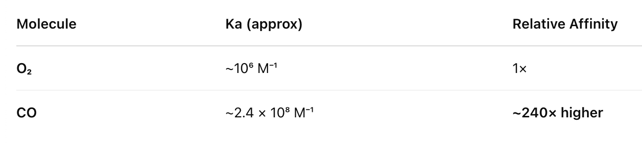 CO binds to hemoglobin 240 times more tightly than oxygen (Table 1). This isn’t just competition — it’s chemical "armed robbery." CO blocks oxygen from attaching to hemoglobin and displaces oxygen that’s already bound because of the differences in binding affinity.