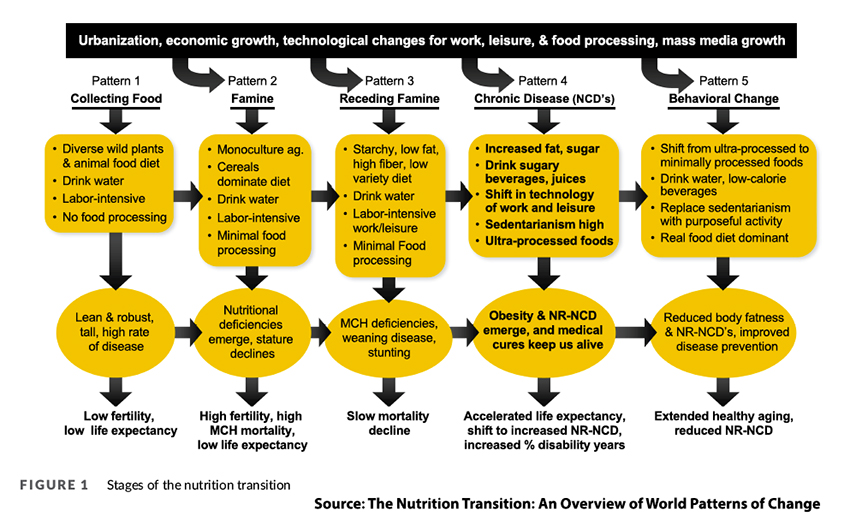 Globally, no countries remain in Stage 1, collecting food, or Stage 2, with episodic famine; famine today is primarily the result of armed conflict or natural disasters. Many low- and middle-income countries (LMIC) are in Stage 3. There is increasing consumption of fruits, vegetables, and animal proteins and diminished emphasis on starchy staples. The rapid transition to a “Western diet” [1] often results in a double burden of malnourished and overnourished individuals. Lagging public health measures leave them with both communicable and rising noncommunicable diseases.