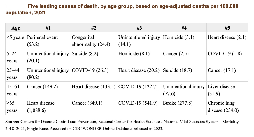 The elderly are far more susceptible to heart disease and cancer (in that order) and only confront COVID-19 as the third leading cause of death. Indeed, in 2021, the elderly were twice as likely to succumb to heart disease as they were to COVID-19.