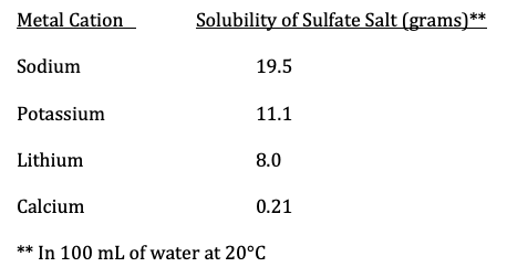 In Table 1, sulfate (SO4-2), a common anion, was chosen as an example because its solubility in water varies substantially depending on the metal it is paired with. Compared to sodium, potassium, and lithium sulfate, calcium sulfate is 40-100 times less soluble in water. The same trend is seen with other common anions, such as hydroxide, phosphate, and acetate. In each case, calcium salts are less soluble than those of the three other metals.