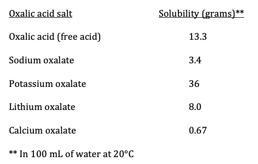 Table 2. The water solubility of metal cations of oxalic acid @20°C. Oxalic acid itself is not anionic but is still water soluble. Solubility data for both tables is taken from the Wikipedia Solubility Table.