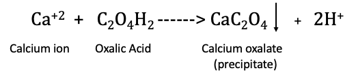 Figure 1. The formation of calcium oxalate. Two soluble species, calcium ion, and oxalic acid react, forming insoluble (crystalline) calcium oxalate, which precipitates as a solid - the stone.