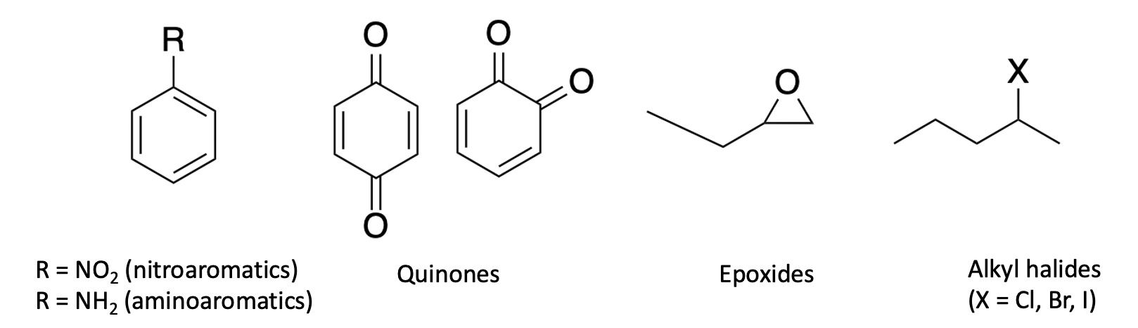Figure 1. Common toxicophores include nitroaromatics, aminoaromatics (anilines), quinones, and alkyl halides. Chemicals bearing them are generally bad news.