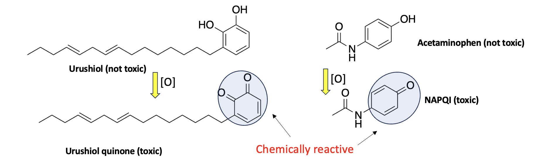 Figure 3. Neither urushiol nor Tylenol (acetaminophen) are toxic until they are oxidized. The reactive part of both molecules is shaded in blue.