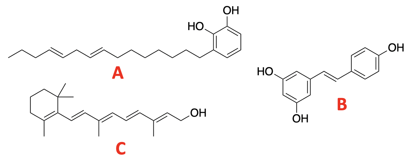 Figure 2. Molecule A contains a long chain of carbon atoms, one carbon-carbon double bond, and two hydroxyl groups. Molecule B contains one carbon-carbon double bond, two phenyl rings, and three hydroxyl groups. Molecule C also has a long chain of carbon atoms, five carbon-carbon double bonds, and one hydroxyl group. How "good" are these chemicals?
