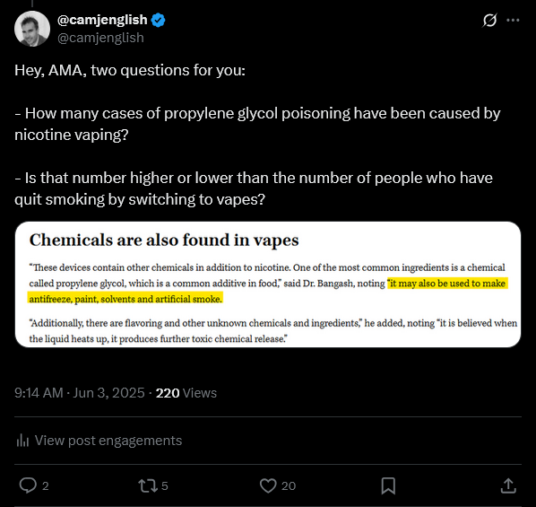 To illustrate this point about risk, I asked the AMA on X how many cases of PG poisoning have been caused by nicotine vaping, and if that number is greater than the number of smokers who have quit by switching to vaping. They didn’t bother to reply, and that’s probably because this comparison destroys their argument.
