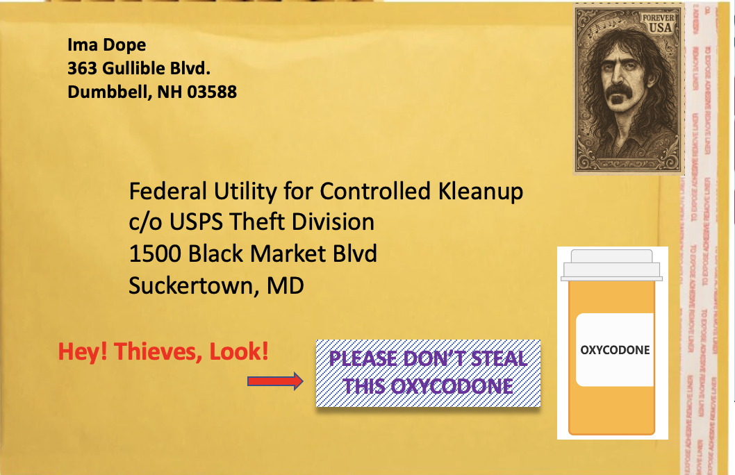 On another note: Years ago, he also informed me that a good U S Postal Service Worker can smell money in an envelope and also showed me how to remove it from the envelope without opening it. Using only a "Hair Pin"... I have a question. Is it not illegal to send narcotics through the mail? Unless of course, it's from China."