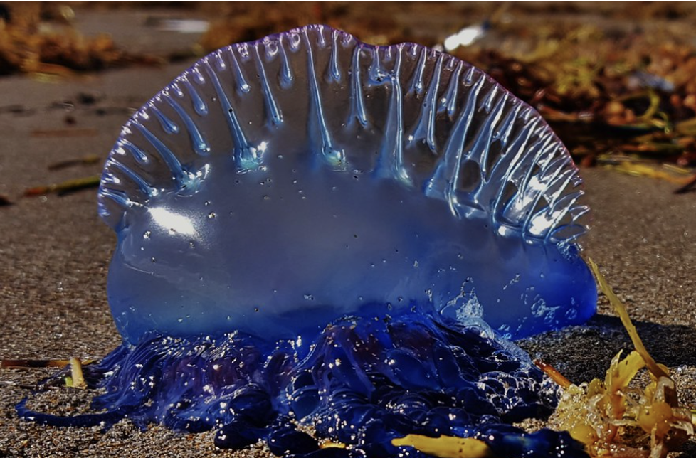 - They are very easy to spot because of a bright blue balloon-like air sac that floats atop the water.