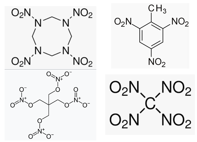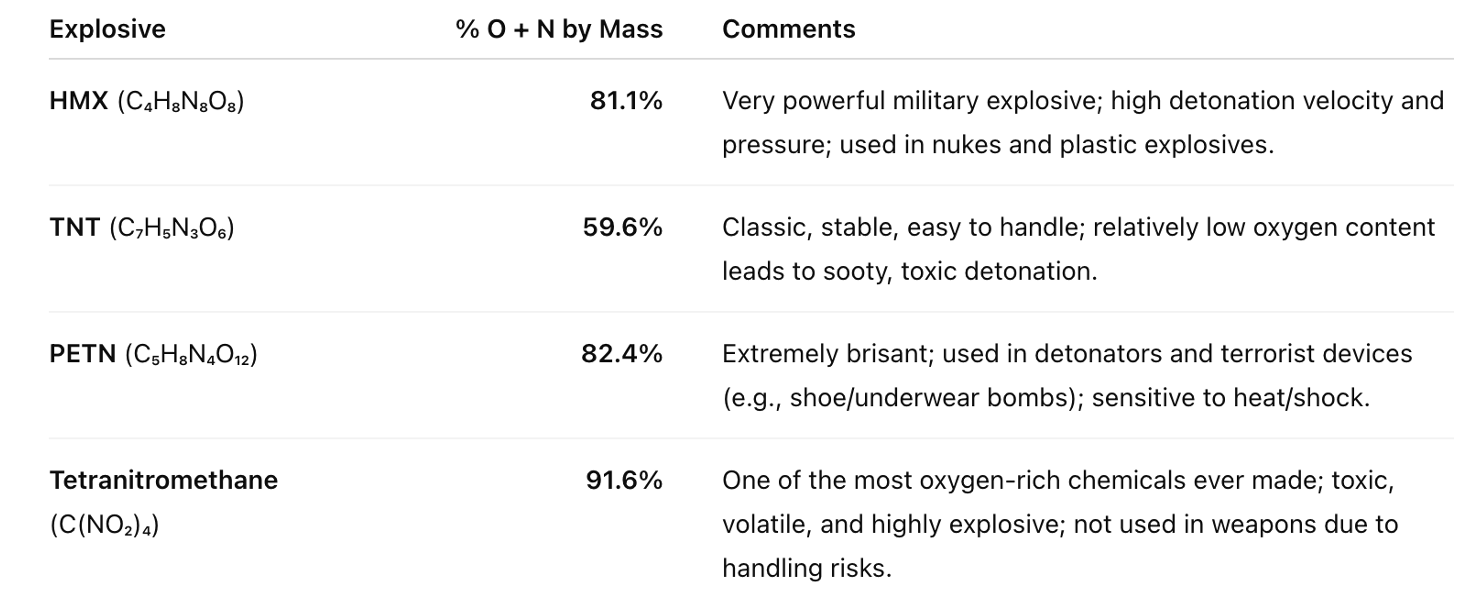Figure 1 (Top): Four of the most demonic explosives, their oxygen + nitrogen content, and some vaguely disturbing comments.
