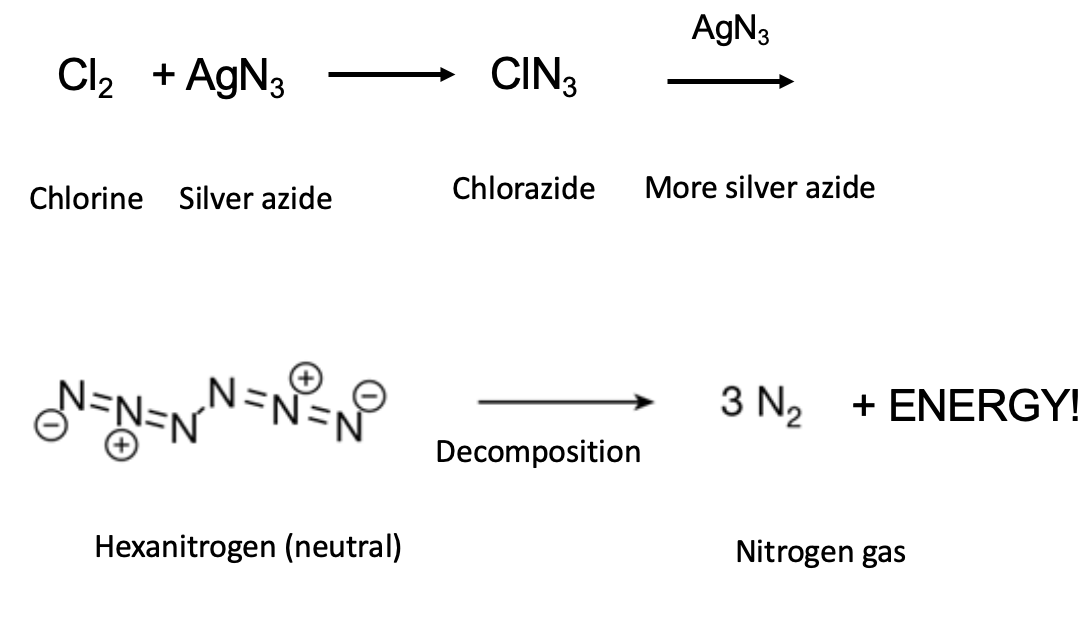 But note the final step. When hexanitrogen decomposes, it gives off nothing other than non-toxic, non-polluting N2, making it a perfect fuel. Of course, turning a high-energy explosive made on a milligram scale in a lab is still a long way from becoming a useful, controllable propellant. This is no small feat that remains unsolved.