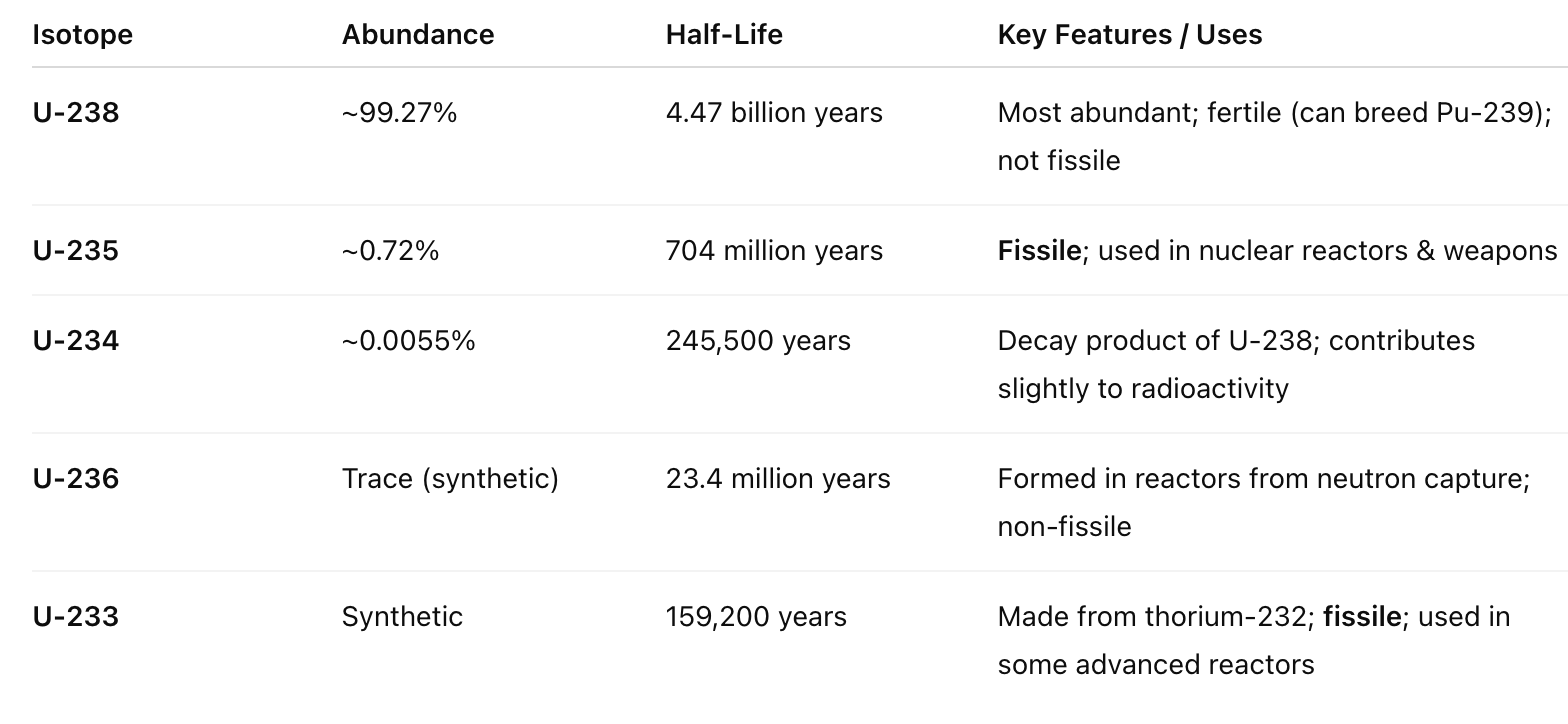 Table 1. The four uranium isotopes. Note the relative abundance of U-238 and U-235. It is approximately 140 times more abundant in U-238, making it a pain in the ass to obtain purified U-235. The minute difference in weight is what makes it possible to obtain U-235 via high-speed rotation in gas centrifuges. Possible, but not easy.