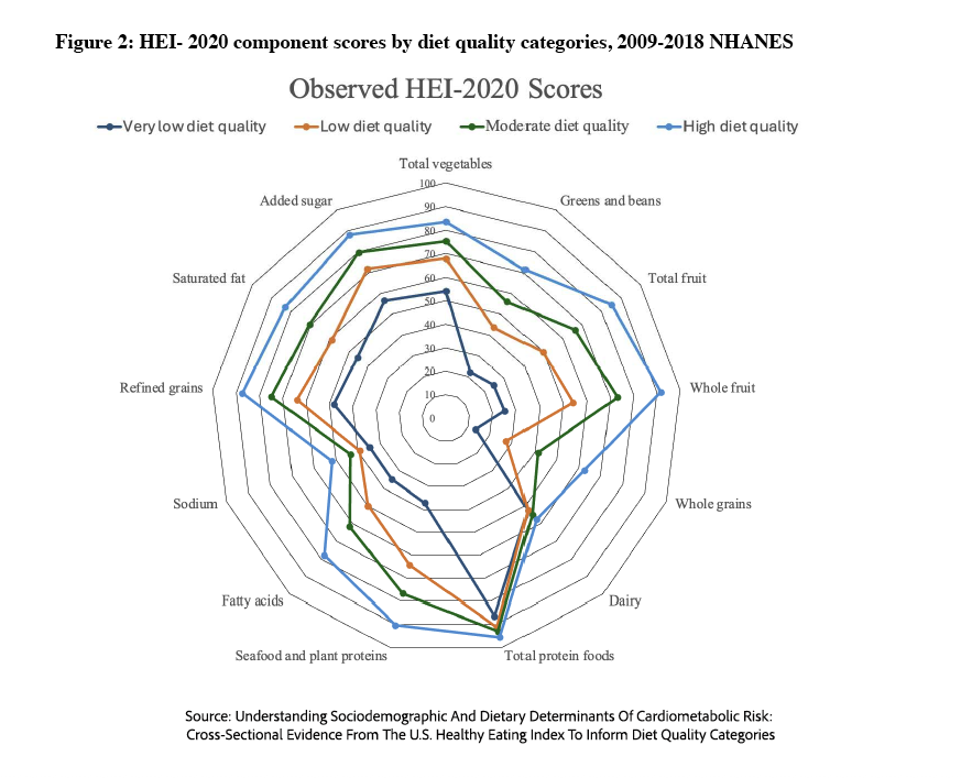 Over the years, there have been bipartisan calls for monitoring the quality of diets and the impact of federal programs. HEI is frequently used as a metric for the efficacy of SNAP, or, for that matter, any diet promoting healthy eating, which is MAHA’s mantra. The importance of this study lies in how well their HEI categorization reflects a healthy diet and the associated risk of chronic illnesses, particularly diabetes, obesity, and cardiovascular disease, all of which are closely tied to diet.