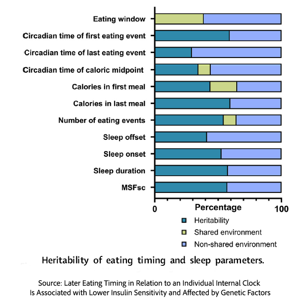 High heritability, defined as greater than 50%, was found for the circadian timing of the first “eating event,” the number of those events, and the percentage of energy consumed in the last daily meal. There was a similar genetic influence on the sleep parameters used to define individual circadian rhythms. In noting that this genetic influence may make shifting meal times more challenging, it is essential to remember that, despite this being a twin study, environmental and cultural factors, such as when and how we eat, can be transmitted across generations.