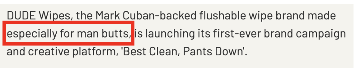 Let’s be clear: there is no universe in which suggesting men are superior to women is a safe endeavor. Not even in the “plop crop” or “doodie dimension.” Yet three “doods” strutted onto Shark Tank, pitched their extra-large fragrance-free wipes, and "man-friendly"  idea, they found their patron saint in Mark Cuban— the owner of the Dallas Mavericks, a team that’s managed exactly one NBA championship in 25 years. Next thing you know, they were flush [1] with cash.