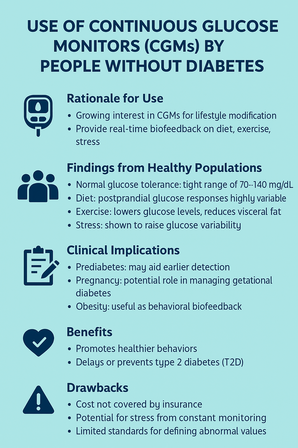 A recent study examining expert clinical interpretation of “atypical” CGM reports in individuals without diabetes found significant variability among clinicians with extensive CGM experience. The modest agreement was that more than half of clinicians recommended follow-up with a healthcare provider if CGM data showed more than 2% of time above 180 mg/dL. This finding is particularly relevant given that in the Framingham Heart Study, about 20% of adults spent more than 2% of time above this threshold. CGMs marketed to people without diabetes will place added time burdens on healthcare providers, additional screening costs to society, while leaving patients with unclear guidance and no apparent reduction in risk. The current evidence does not support CGMs as a stand-alone screening tool. Further research is needed to clarify benefits, best practices, and standards.